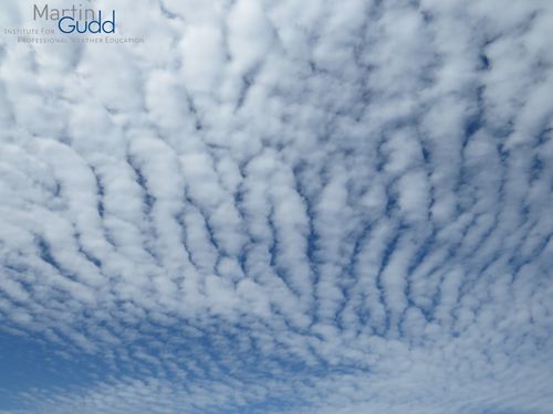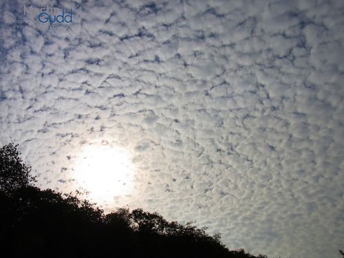 Die Lücken zwischen den einzelnen Wolkenelementen des Ac stratiformis können dabei sehr unterschiedliche Ausmaße annehmen. Mitunter sind sie kaum wahrnehmbar, so wie in folgendem Bild: